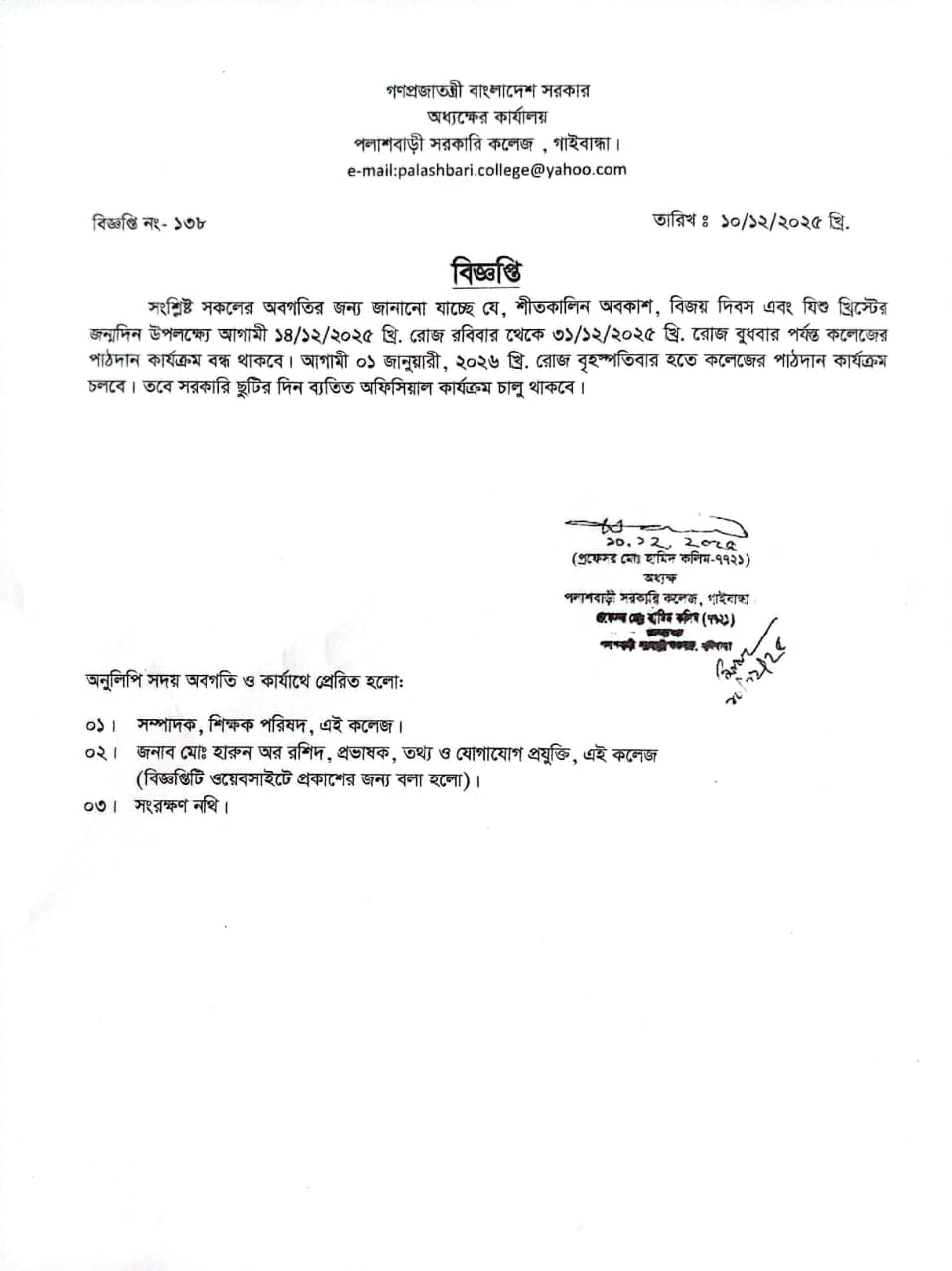 - শীতকালীন অবকাশ, বিজয় দিবস এবং যীশু খ্রিস্টের জন্মদিন উপলক্ষ্যে পাঠদান কার্যক্রম বন্ধ সংক্রান্ত নোটিশ