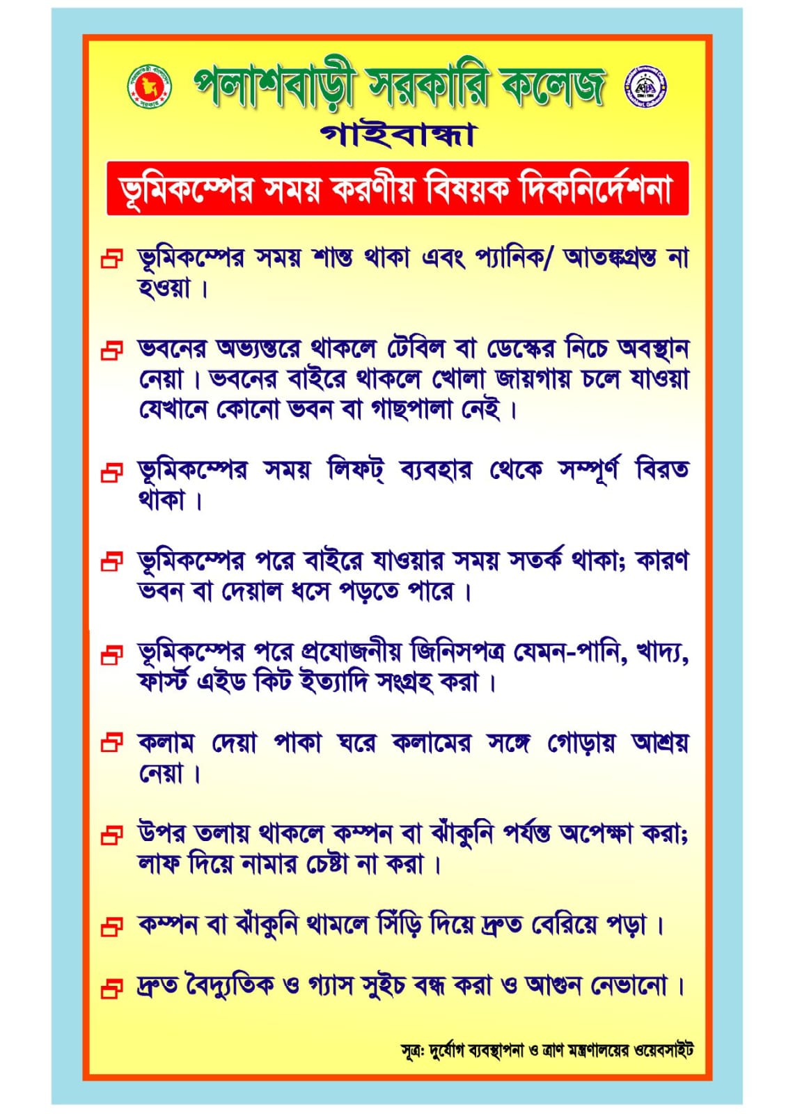 - ভূমিকম্পের সময় করণীয় বিষয়ক দিকনির্দেশনা সম্পর্কিত নোটিশ