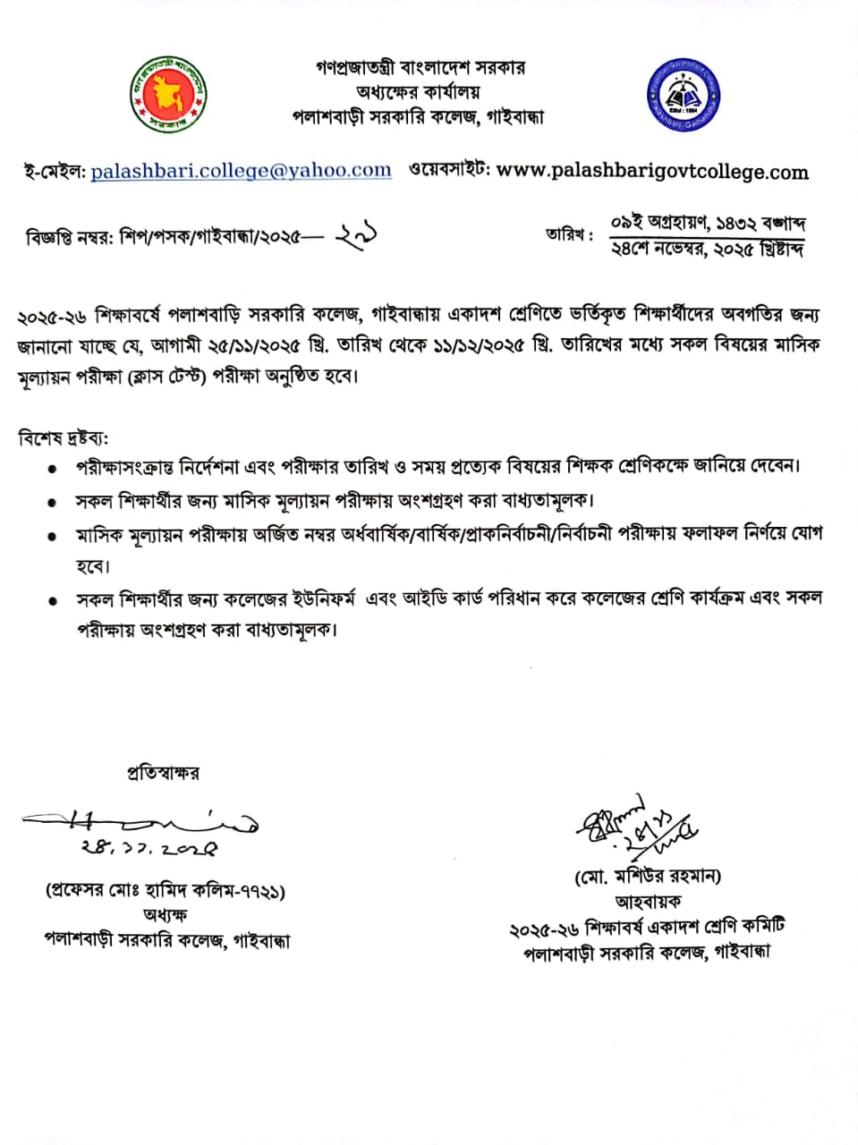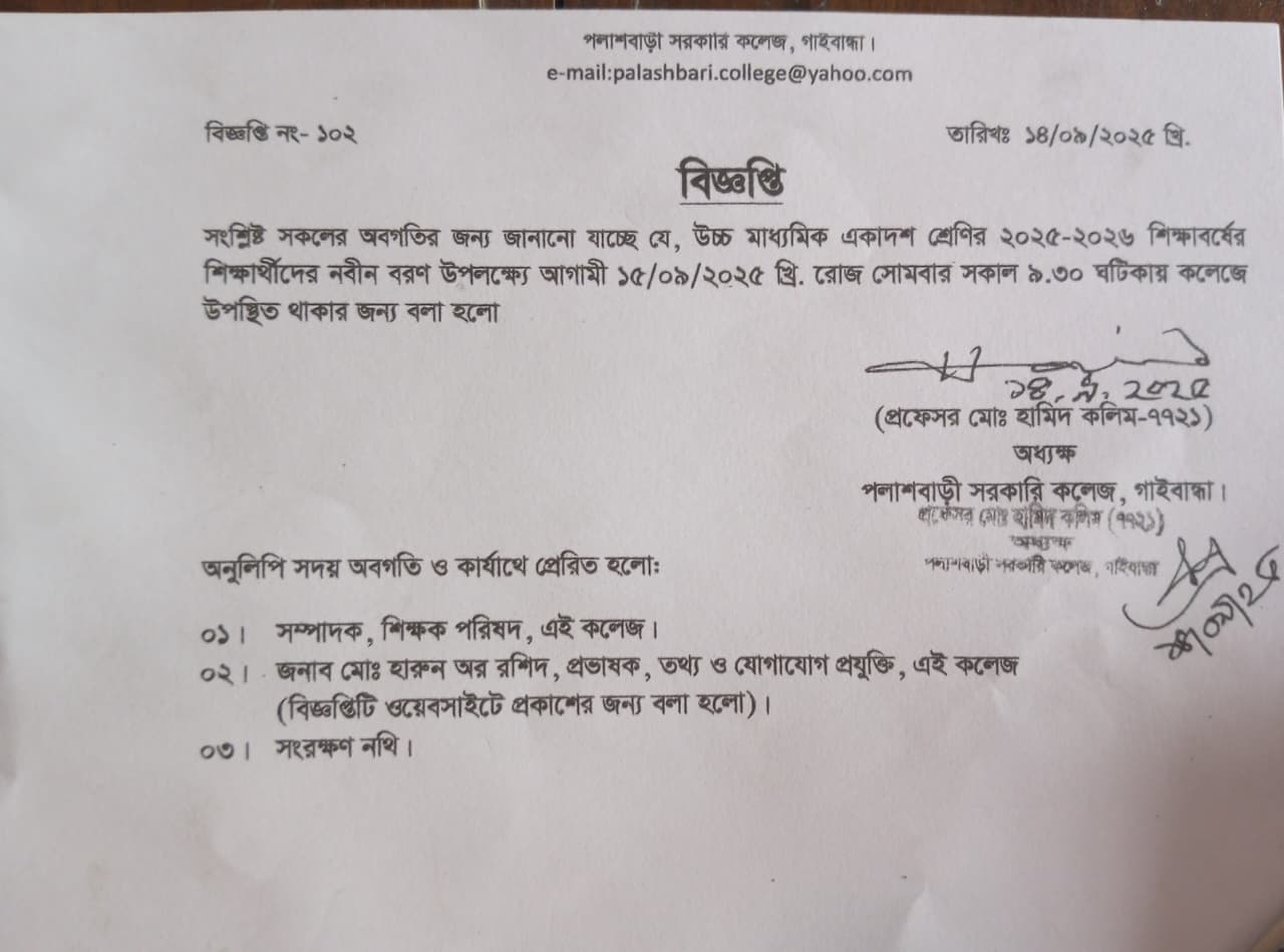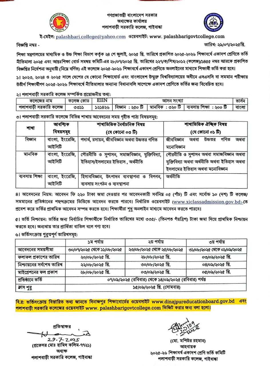- ২০২৫-২০২৬ শিক্ষাবর্ষে একাদশ শ্রেণিতে ভর্তি সম্পর্কিত নোটিশ