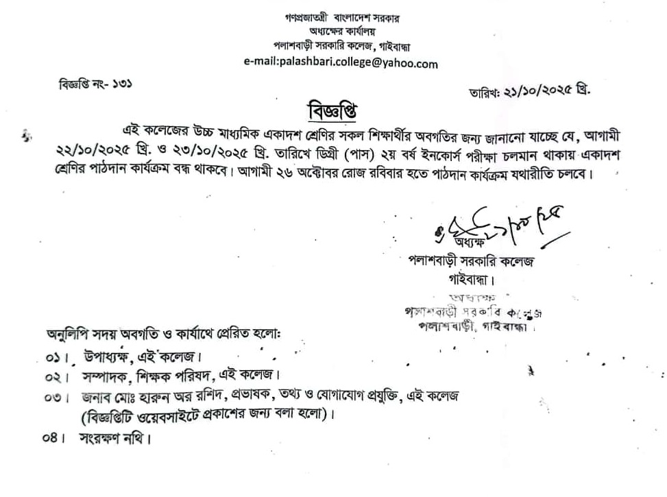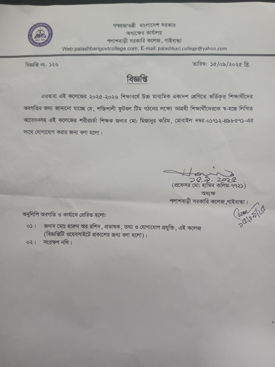 - পলাশবাড়ী সরকারি কলেজের ফুটবল টিম গঠনের লক্ষ্যে ২০২৫-২০২৬ শিক্ষাবর্ষের শিক্ষার্থীদের মধ্য থেকে আবেদন আহ্বান সম্পর্কিত নোটিশ