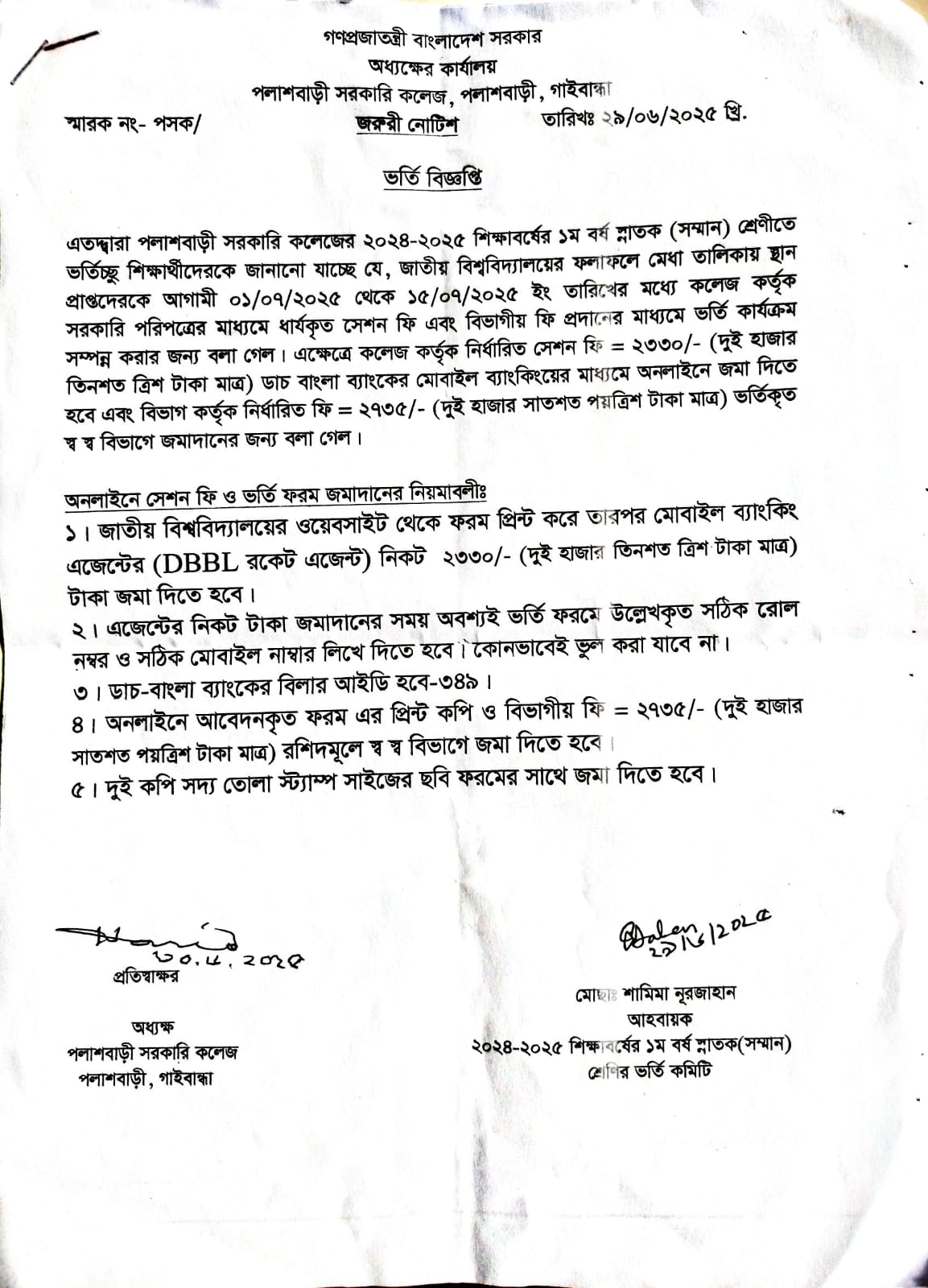 - ২০২৪-২০২৫ শিক্ষাবর্ষের ১ম বর্ষ স্নাতক (সম্মান) শ্রেণিতে ভর্তি সম্পর্কিত নোটিশ