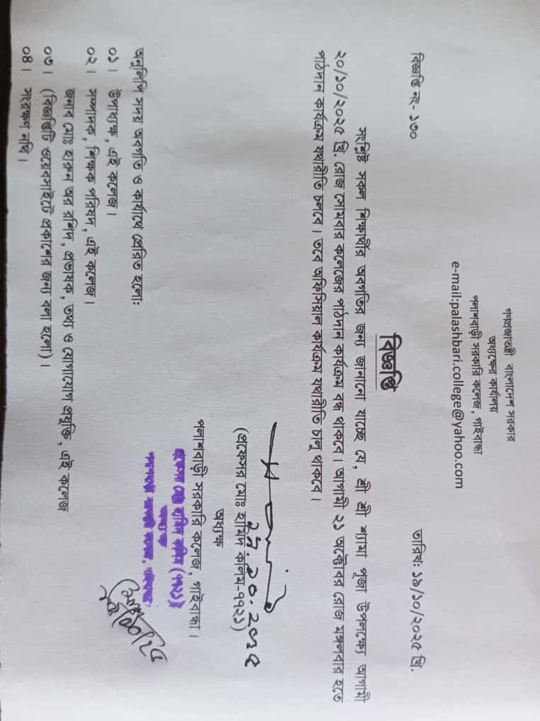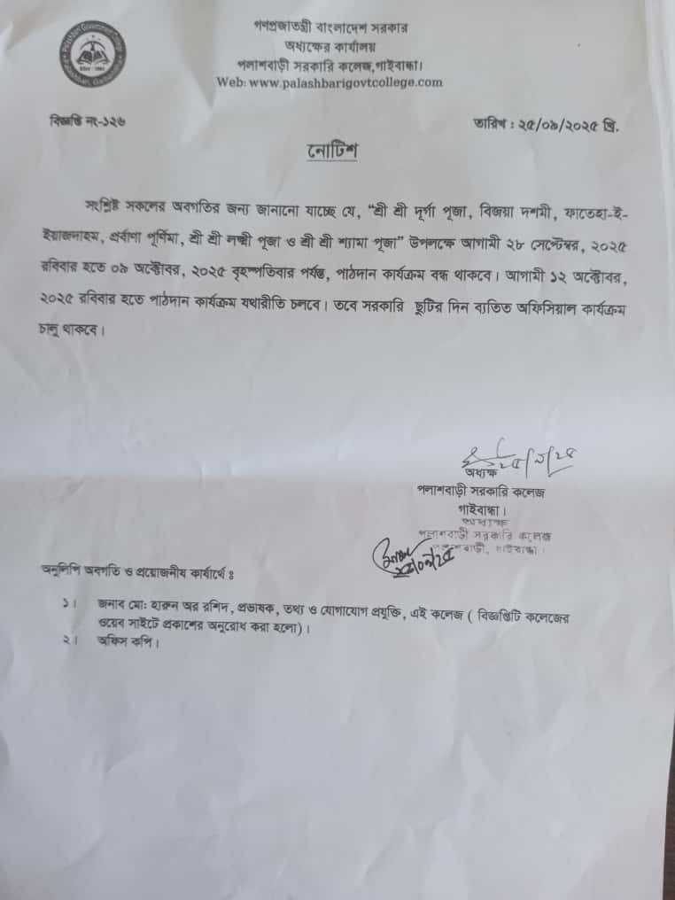 - শ্রী শ্রী শ্যামা পূজা উপলক্ষে আগামী ২০/১০/২০২৫ খ্রিস্টাব্দ রোজ সোমবার কলেজের পাঠদান কার্যক্রম বন্ধ প্রসঙ্গে নোটিশ
