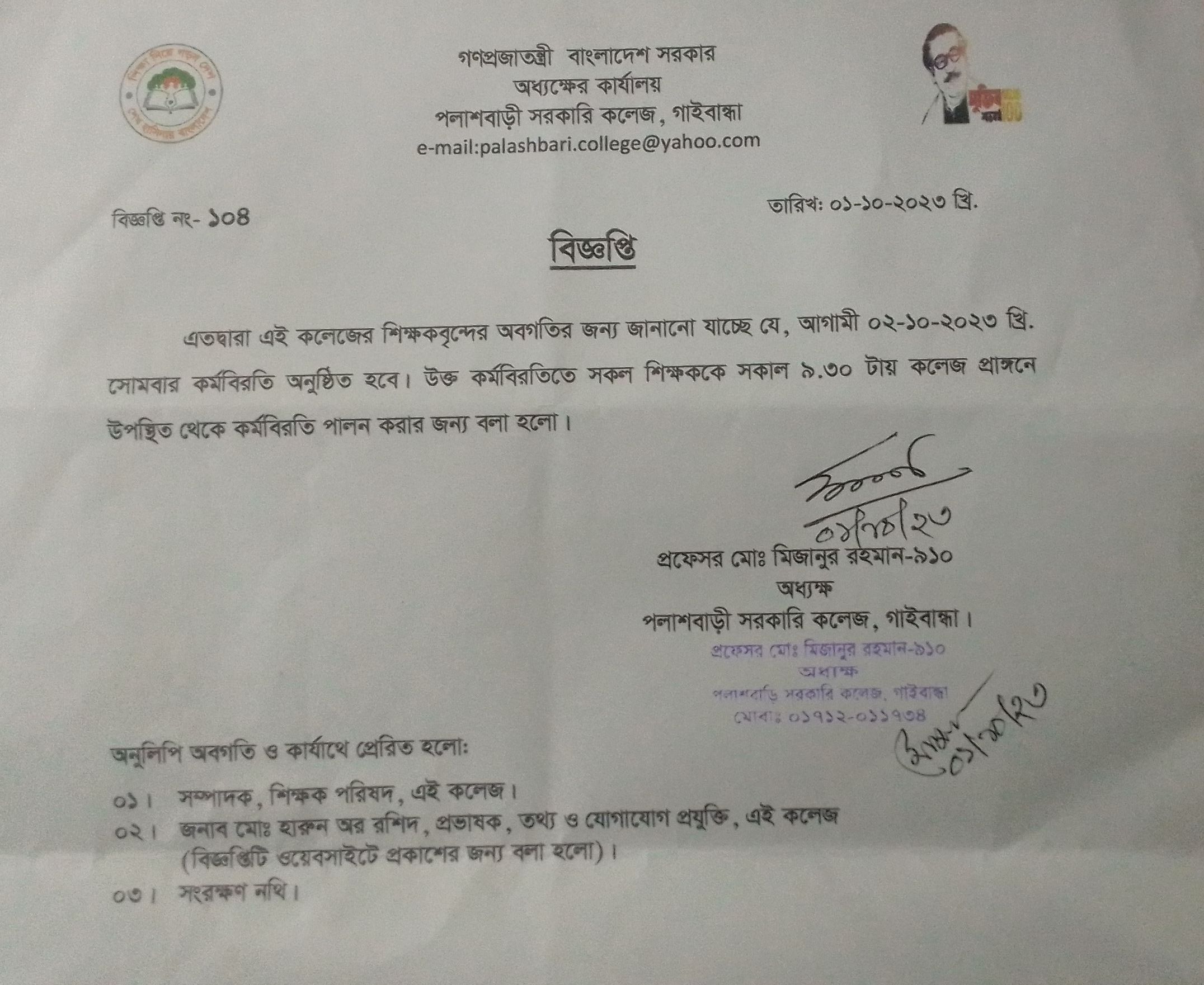 - কলেজের পাঠদান কার্যক্রম বন্ধ সম্পর্কিত সংক্রান্ত নোটিশ